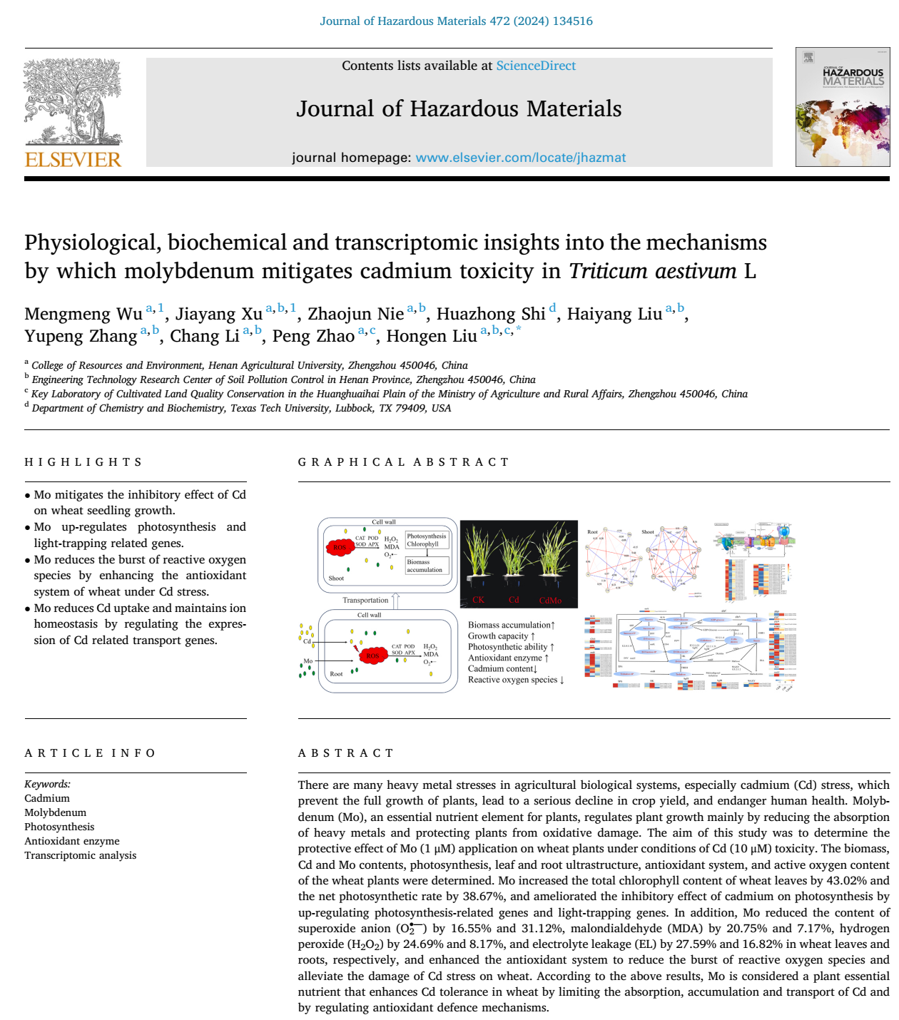 本研究是课题组在微量元素缓解小麦镉毒害方面取得的最新进展。av解说 2022级硕士研究生吴孟孟和许嘉阳副教授为论文共同第一作者,刘红恩教授为通讯作者。av解说 赵鹏教授、聂兆君副教授、李畅副教授、刘亥扬博士和张玉鹏博士为该项工作做出了重要贡献。美国德克萨斯理工大学施华中教授对论文内容进行了具体指导。该研究得到“十四五”国家重点研发项目(2021YFD1700900)、河南省土壤污染防治专项(HNNH-2023-001)、河南省高校重点研究项目基础研究项目(19zx007)和河南省自然科学基金(222300420464)等项目的资助。