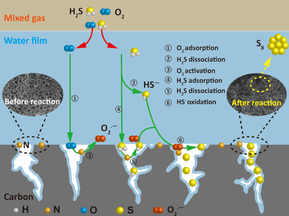 2-TPD、EPR、XPS、XRD等表征技术分析,揭示NPC实现高效脱硫并将硫化氢转化为硫磺资源的关键在于NPC中具有路易斯碱性的氮位点,其不仅促进了孔隙表面碱性水膜的形成,加速了硫化氢的吸附与解离,而且在活化氧气形成活性氧的过程中也发挥了积极促进作用。本研究为定向开发高效碳质催化剂以实现生物天然气中硫化氢的常温持久性净化提供了新思路,同时也为农林废弃物的高值化利用提供了新途径。研究成果以“3D-interconnected N-doped porous carbon with hierarchical pore structure as a high-efficiency catalyst for H