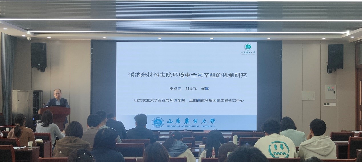 2023年10月14日上午,山东农业大学av解说 副院长李成亮教授应邀在龙子湖校区力行楼中338报告厅作“碳纳米材料去除环境中全氟辛酸的机制研究”学术报告,院长王宜伦教授主持,学院部分教师和研究生参加了报告会。