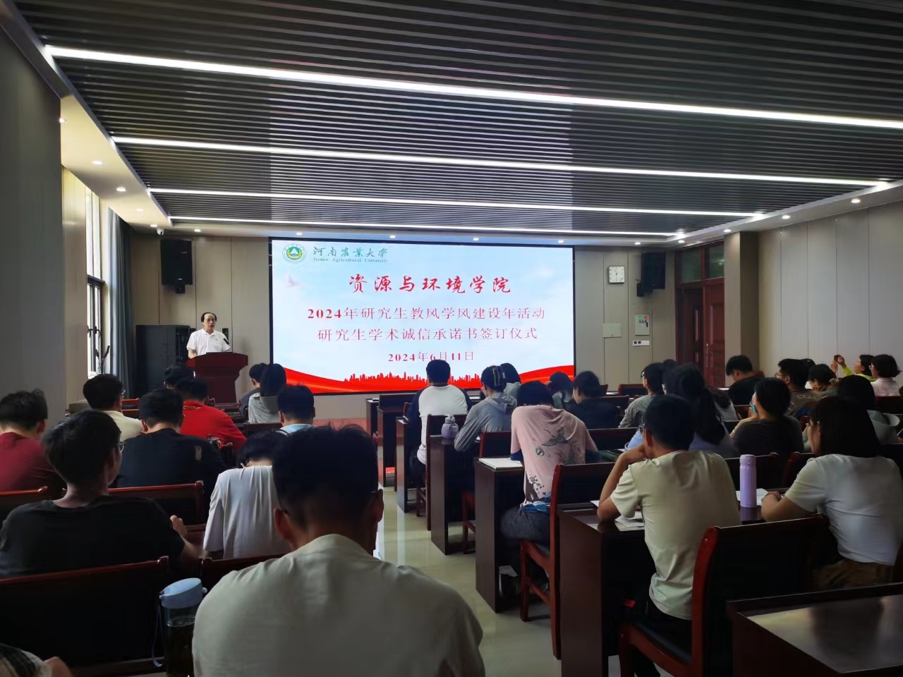 为深入加强研究生学术诚信教育和学术规范指导,进一步提高学生诚信意识,持续营造良好学术氛围,2024年6月11日,av解说 举行研究生学术诚信承诺书签字仪式。副院长刘世亮出席仪式,资环学院全体研究生参加。