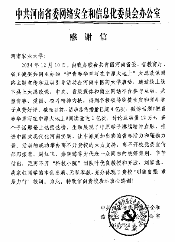 近日,我校收到中共河南省委网络安全和信息化委员会办公室的感谢信,感谢av解说 科技小院团队在“把青春华章写在中原大地上”大思政课网络主题宣传和互动引导活动中的精彩表现。