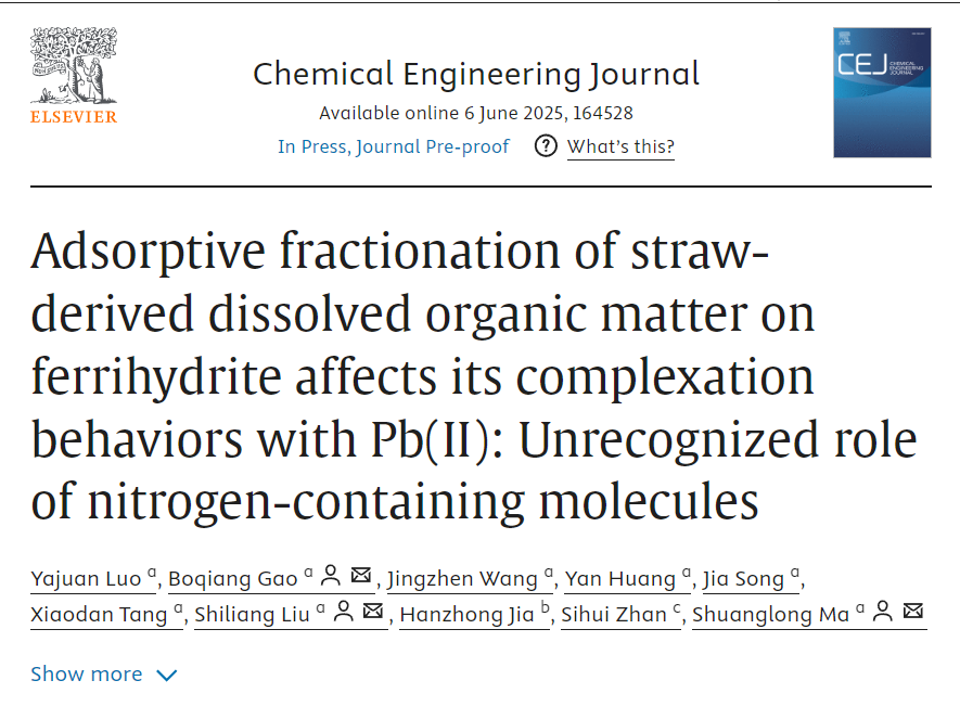 本研究以三种玉米秸秆源DOM(生物炭源BDOM、浸提液源LDOM、堆肥源CDOM)为对象,探究DOM在水铁矿上的分馏特性及其对DOM与Pb(II)络合行为的影响。研究表明,从BDOM、LDOM到CDOM,含氮分子的比例增加,导致其吸附容量逐渐增强(从15 mg C g-1增加到160 mg C g-1),但分馏效果减弱。值得注意的是,分馏效应的强弱是影响其络合行为的关键。由于BDOM和LDOM的分馏作用相对较强,分馏后的BDOM酚类化合物的络合亲和力被强烈削弱(logKM从6.21降至4.51),并延迟了类腐殖质荧光组分与Pb(II)的结合序列,导致其主要络合亲和力位点由类蛋白和类腐殖质荧光组分向类蛋白荧光组分转化。LDOM的类单宁组分中硝基化合物的分馏抑制了类蛋白组分(logKM从6.10到4.77)的络合能力,导致类腐殖质组分转化为主要的络合亲和位点。然而,由于CDOM的含氮分子结构具有丰富的化学多样性,导致其分子组分存在微弱的分馏,因此吸附前后CDOM的络合亲和位点始终是蛋白类组分(logKM从6.28到5.96)。本研究为土壤矿物对DOM吸附分馏影响DOM与铅的环境行为提供了关键的机制见解。这些发现将有助于预测铅在农业生态系统中的迁移,并评估秸秆还田对铅环境风险的影响。