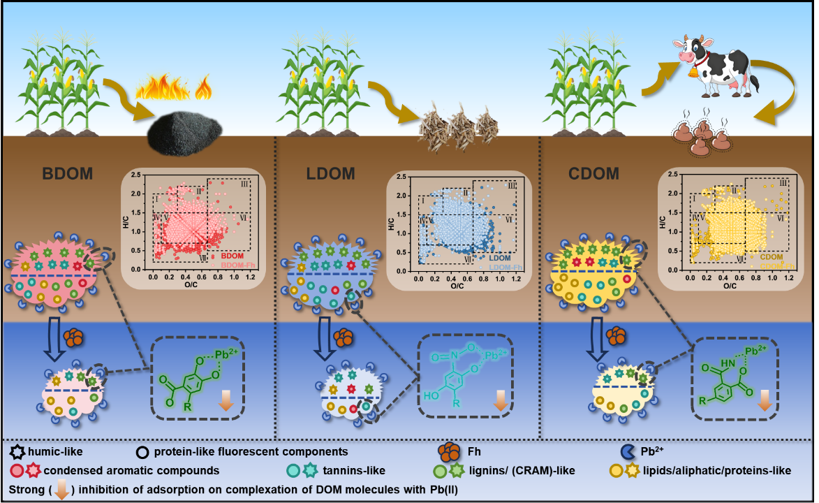 秸秆还田作为绿色农业策略可提升土壤质量,但不同处理方式(直接还田、炭化还田、粪肥堆肥还田)产生的溶解性有机质(DOM)组分差异显著,其在土壤和水体中通过吸附分馏作用影响重金属迁移。铁氧化物(如水铁矿)对DOM的吸附分馏可能改变DOM与Pb(II)的络合行为,但含氮分子在分馏过程中的作用机制尚不明确。