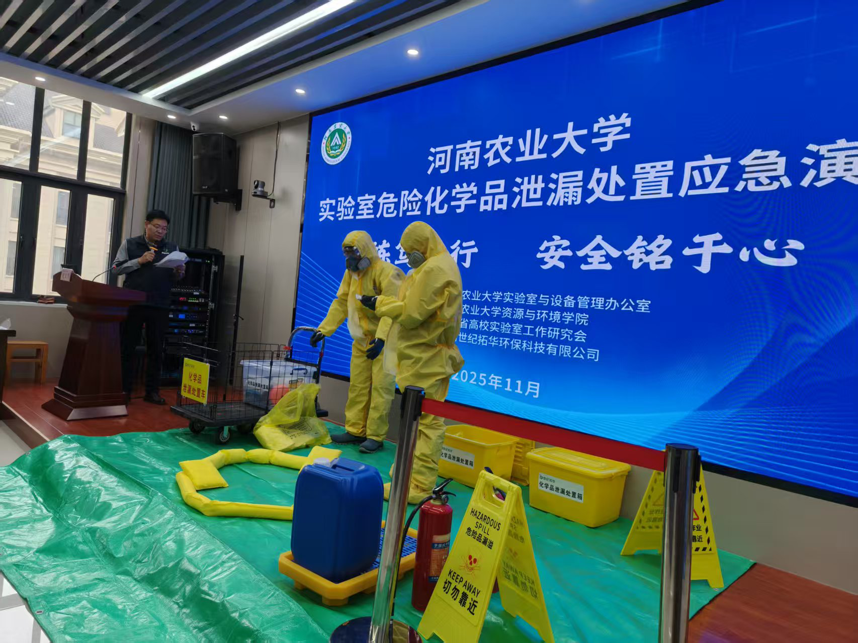 作为本次演练的协助单位,av解说 始终将实验室安全置于重要位置,尤其重视危化品泄漏应急处置工作。演练伊始,院党委书记李兴道致辞,他表示,危化品是教学科研的重要支撑,但泄漏风险直接威胁师生安全与周边环境,学院秉持 “防患于未然”原则,希望通过模拟真实场景,帮助师生熟悉处置流程、掌握应急技能,为应对突发事故做好准备。演练以“情景构建+实战处置”模式展开,以“学生倾倒废液时发生溢撒泄漏”为背景,完整演示应急全流程:从事故第一时间上报、现场人员有序撤离、危险区域封锁,到专业团队开展危害评估、救援人员规范穿戴防护装备、科学消除危险源,再到最终完成现场恢复,各环节衔接紧密、操作规范。河南世纪拓华环保科技有限公司技术团队全程现场指导,让师生沉浸式掌握实战处置要点。最后,实验室与设备管理办公室主任田志强做总结讲话,他指出本次演练贴合实际、组织有序,希望各单位以此次演练为契机,进一步强化安全意识,将应急技能融入日常实验室管理。