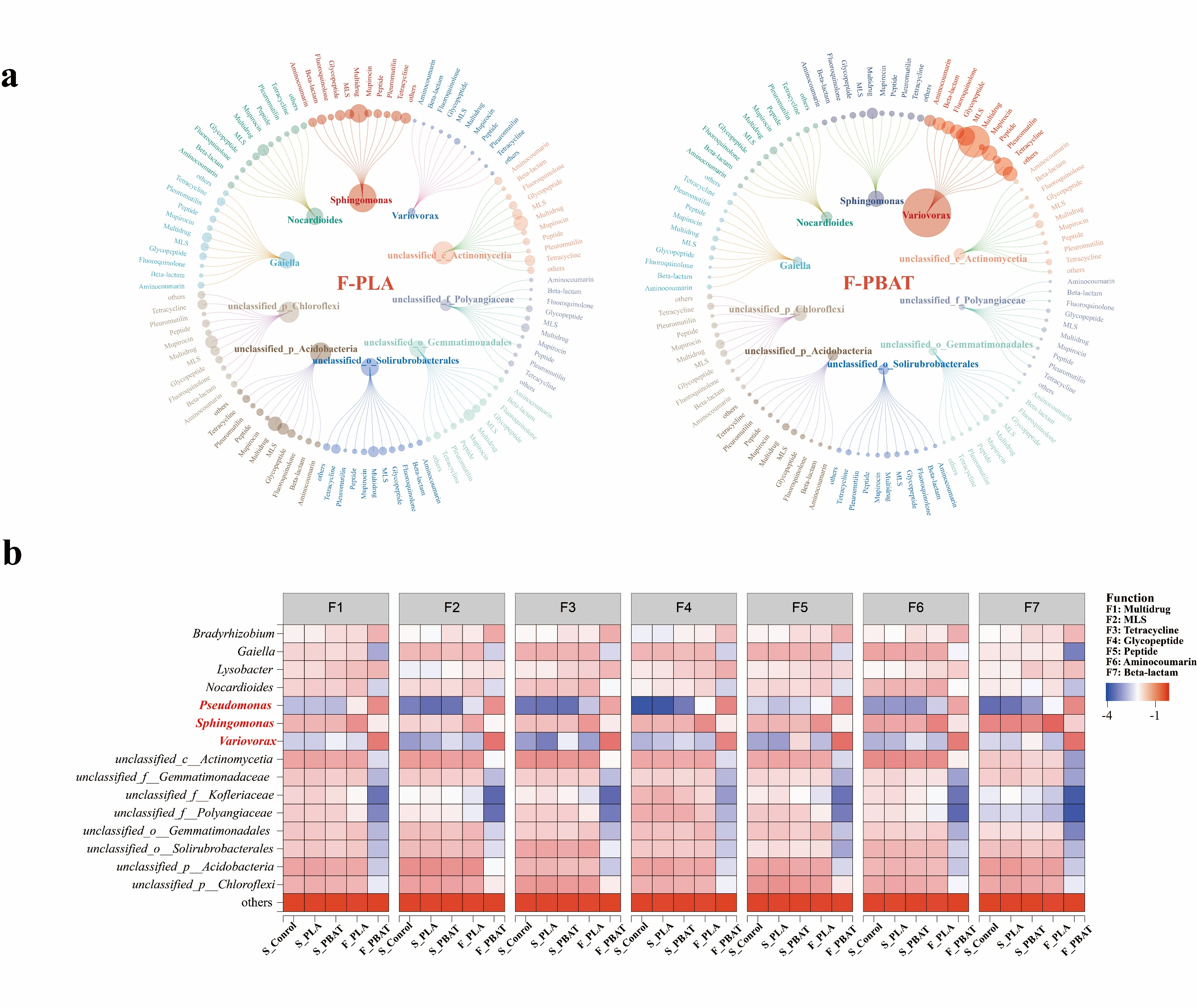 本研究以可生物降解塑料膜聚己二酸-对苯二甲酸丁二醇酯(PBAT)和聚乳酸(PLA)为研究对象,开展了为期120天的土壤培养实验,系统探究其降解过程、塑料际微生物群落演替及ARGs传播机制。结果表明,PBAT塑料膜在土壤中的降解速率显著高于PLA。宏基因组学分析发现,PBAT塑料表面富集了Variovorax、Pseudomonas、Rhodococcus等降解菌,而PLA表面则以Sphingomonas为主。这些富集的微生物不仅是塑料降解的关键驱动者,同时也是ARGs的重要宿主,尤其在PBAT塑料际中ARGs丰度显著高于土壤背景,约是对照组的3倍。通过宏基因组组装基因组(MAGs)进一步分析发现,PBAT塑料际的降解菌携带大量ARGs和可移动遗传元件(MGEs),且与毒力因子(VFs)在基因组中共定位,形成了有利于水平基因转移(HGT)的遗传结构。在PBAT塑料际还识别出以Variovorax paradoxus为代表的HGT供体菌,能成功将ARGs传递至周围土壤中的受体菌,证实了塑料际向土壤环境中ARGs扩散的潜在路径。该研究首次从“降解菌-抗性基因-可移动元件”协同富集的视角,揭示了可生物降解塑料降解过程中形成的塑料际不仅是微生物活动的热点区域,更是抗性基因传播的潜在“引擎”。研究强调,PBAT相较于PLA具有更高的抗性基因传播风险,因此,在推广可生物降解塑料时需综合考虑其生态健康影响。该成果为在“One Health”框架下开展塑料污染风险评估与防控策略提供了重要科学依据。