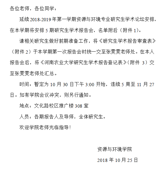 2018~2019学年第一期资源与环境专业研究生学术论坛安排