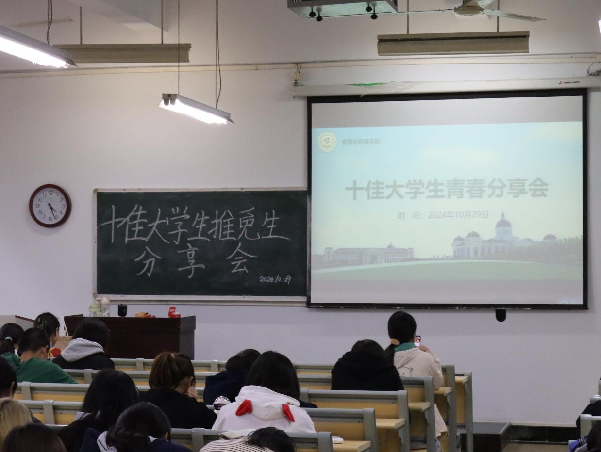 于桃李园学生公寓桃西楼 202 教室成功举办了“十佳大学生”青春分享会。2024 级全体新生参加。